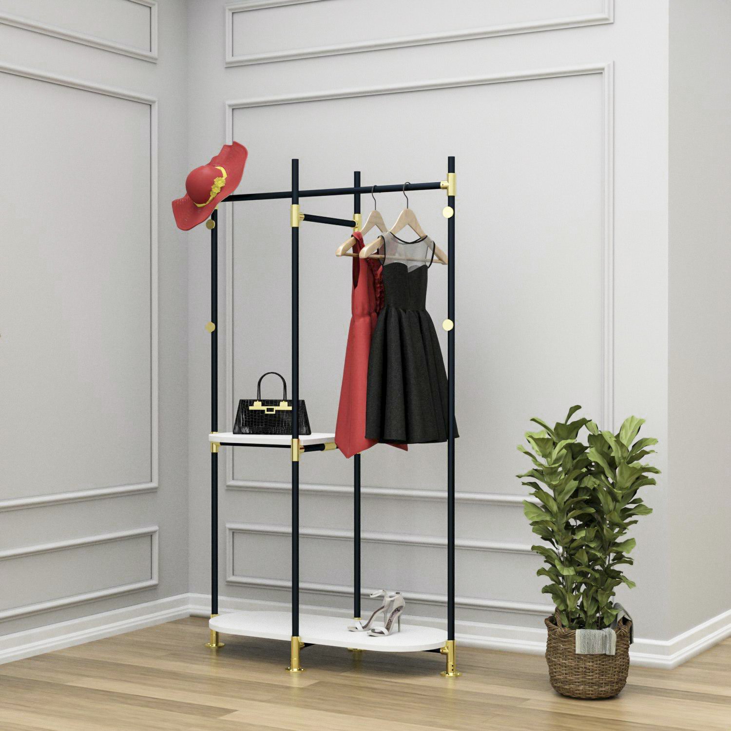 Điểm nhấn độc đáo với cơ cấu lắp ghép toàn bộ bằng khớp nối lắp ốc lục giác mang đến tổng thể một chiếc giá treo áo ấn tượng, phù hợp với không gian nội thất sang trọng, đẳng cấp.