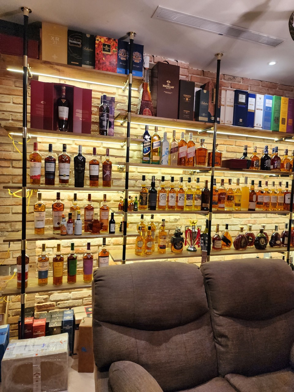 Hoặc không gian không quá lơn và số lượng rượu trưng bày cũng không nhiều, thay vì sắp xếp các ngăn chứa dày đặt, thì có thể làm cách điệu hơn và trang trí thêm một số phụ kiện như, đồng hồ áp suất, van khóa, giá treo ly để vừa tạo điểm nhấn vừa hài hòa các khoảng trống.